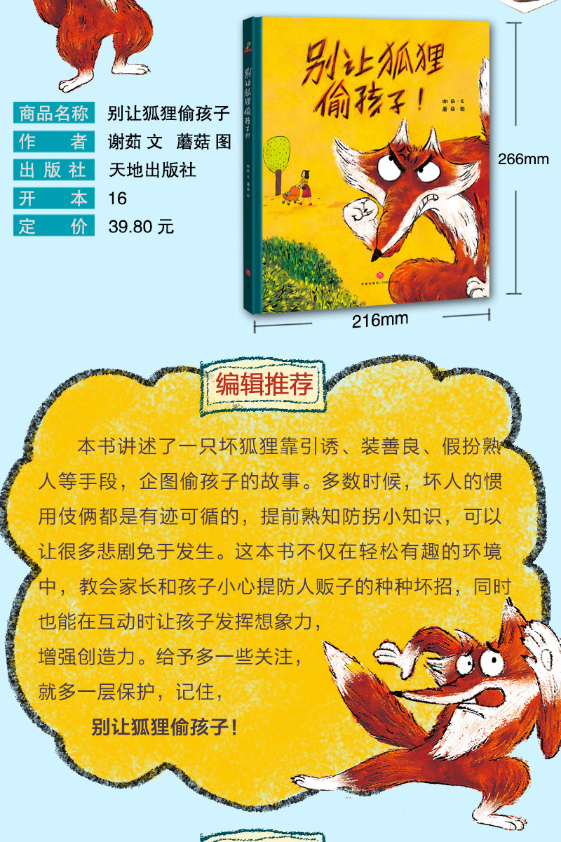 一只坏狐狸在墙上写下了自己准备干的事——偷孩子,他自信一定可以成功。一开始他瞄准了一个,可是那孩子的妈妈寸步不离,于是狐狸只好放弃。突然,他看到了另一位妈妈把自己的宝宝交给了读者照看,狐狸觉得自己的机会来了。他用了好多借口,想骗走孩子,例如:装可怜,用玩具诱惑,扮成孩子的邻居、保姆......他的花招太多啦,阅读这本书的小读者能辨别出狐狸是坏人吗?会上他的当吗?当宝宝的妈妈回来,她又会如何对付这只狐狸呢?