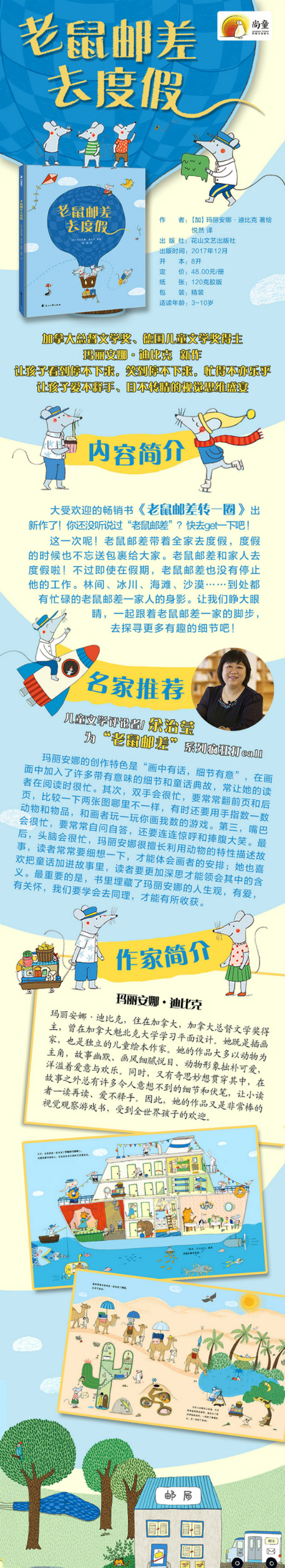 《老鼠邮差去度假》是加拿大总督文学奖、德国儿童文学奖得主玛丽安娜·迪比克新作。之前,我们引进出版过她的《老鼠邮差转一圈》,她“画中有话、细节暗藏”的创作风格,获得了国内家长和小读者的一致欢迎和认可。这一次老鼠邮差带着全家去度假,度假的时候也不忘送包裹给大家。