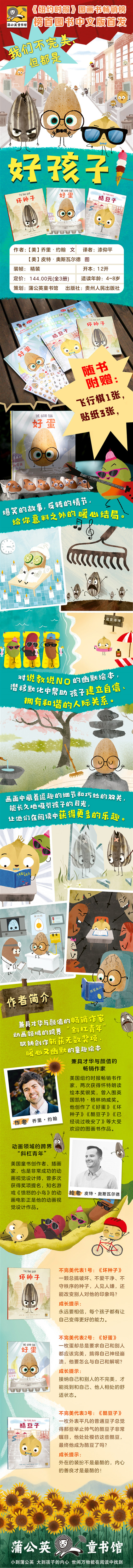 ☆兼具才华与颜值的畅销作家 动画领域的跨界“斜杠青年”=斩获无数奖项、暖心又幽默的童趣绘本 两次获得怀特朗读绘本奖的乔里·约翰与《愤怒的小鸟》动画电影视觉设计师皮特·奥斯瓦尔德强强联手,为孩子们创作了这套暖心又幽默的童趣绘本,一上市便获得了无数好评。 《好蛋》荣获2020年美国儿童和青少年选择奖金奖(4-8岁组)、2019年《纽约时报》图画书热卖榜榜首;青少年图书馆协会2019年选书等。 《坏种子》荣获2019年《纽约时报》图画热卖榜第2名;2017年洛杉矶公共图书馆童书提名等。 《酷豆子》荣获亚马逊2019年受欢迎童书之一;首次登陆《纽约时报》图画书热卖榜榜首。