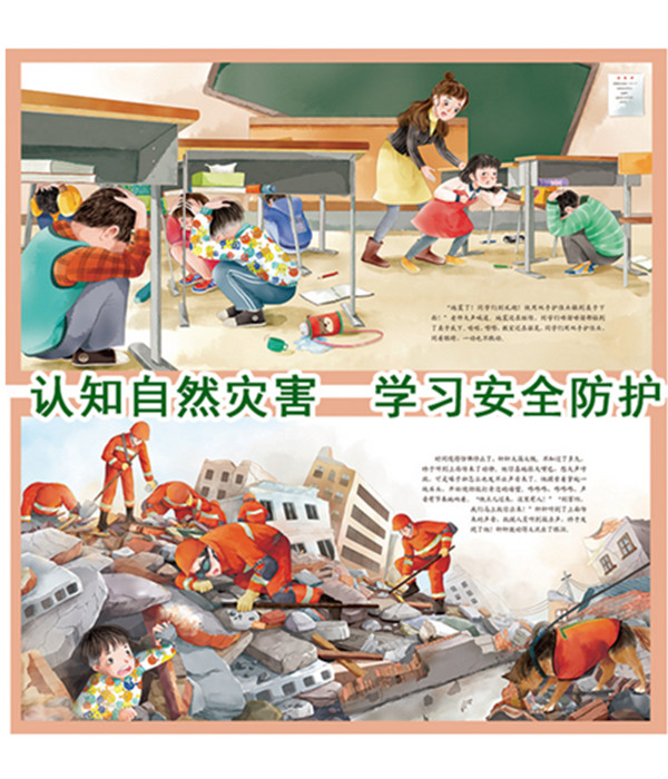 绘本以一个小男孩的视角,讲述了一场地震的发生。在课堂上,地震突然发生,一时间整个世界都在摇摇晃晃,关键时刻,小男孩想起爸爸教过他的地震自救方法,他躲在墙角的桌子下面,躲过了危险,可还是被埋在了废墟里。小男孩谨记爸爸的话,在黑暗中耐心等待救援。终于,废墟被掀开,一束光照了进来,透过光亮,小男孩见到了爸爸,还有很多解放军叔叔,他得救了,也看到了地震后城市的一片废墟,并和爸爸积极投入灾后救援的队伍中……与孩子一起,感受自然、了解自然、敬畏自然、珍惜自然。