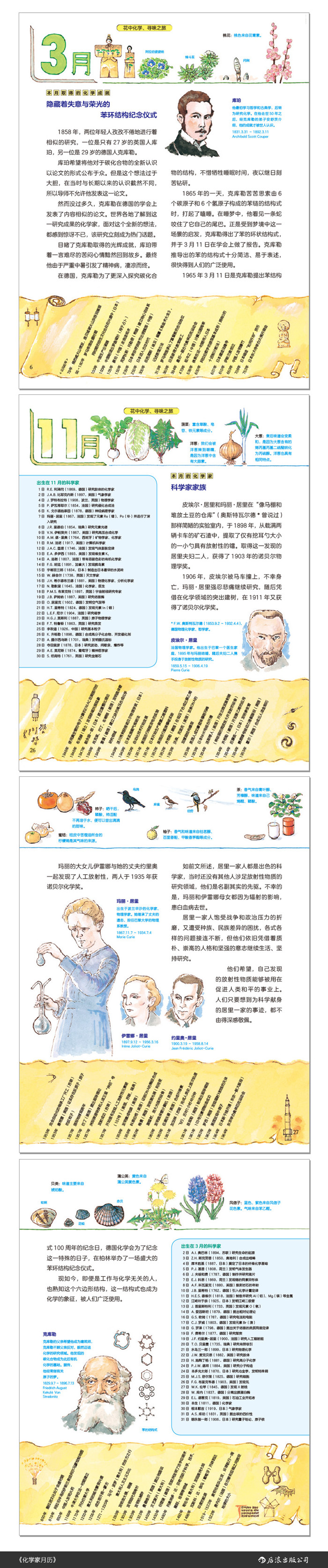 一本讲述化学家故事的手绘化学史,按照12个月的顺序,介绍了33位化学家的成就和趣闻轶事,展现出化学家的高尚人格和良好品质。这些历史上的重大化学发现和化学研究,既能让孩子们了解到科学研究的艰辛,又颇富戏剧性,能为孩子们带来阅读化学史的乐趣。 每个月的故事都搭配了相应人物的手绘图片。全书还从化学的角度介绍了每月的特色食物和花卉,并用贯穿全书的科学家生日日历、科学大事年表让孩子们徜徉在科学史长河中。
