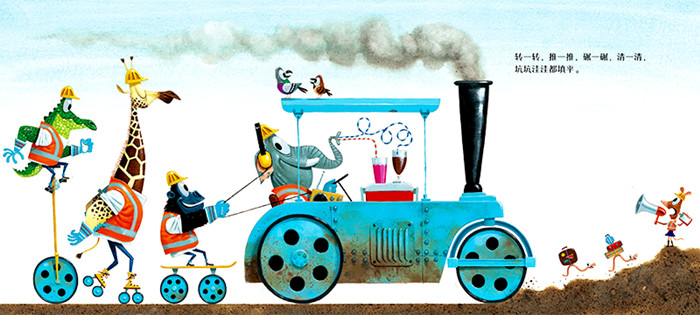 小镇的建筑工人们,叮叮当当忙个不停。设计图纸,填平坑地,垒好砖块,刷满油漆……各式各样的建筑车辆,新奇有趣的建筑工具,眼看完工的日子一天天接近,所有的居民都在好奇——这里是用来做什么的? 这是一本充满知识性和趣味性的绘本,讲述工人们用一周的时间修建一座游乐园,语言押韵,让孩子认识工具与车辆、了解建筑的过程,同时在丰富的动词中培养语言能力。
