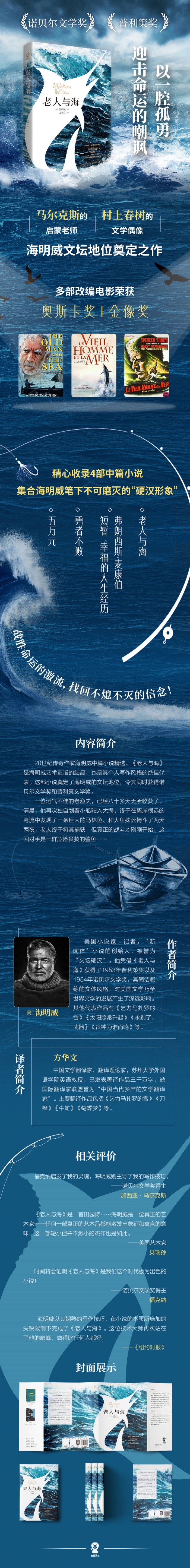 20世纪传奇作家海明威中篇小说精选,收录了《老人与海》《弗朗西斯•麦康伯短暂、幸福的人生经历》《勇者不败》《五万元》等作品。《老人与海》是海明威艺术造诣的结晶,也是其个人写作风格的绝佳代表。这部小说奠定了海明威的文坛地位,令其相继获得诺贝尔文学奖和普利策奖。 一位运气不佳的老渔夫,已经八十多天无所收获了。清晨,他再次独自划着小船驶入大海,终于在离岸很远的湾流中发现了一条巨大的马林鱼。和大鱼殊死搏斗了两天两夜,老人终于将其捕获,但真正的战斗才刚刚开始,这回对手是一群危险贪婪的鲨鱼……