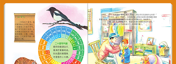 《写给儿童的二十四节气故事》以米米在农村爷爷家中的所见所闻为主线,分为节气由来、天文气候、动物植物、七十二候、农事安排、民俗节气、故事传说、节气古诗等几个版块,通过一段段生动活泼的文字和一幅幅美丽而又有浓郁传统风格的图画,揭示了自然界的魅力和农业的趣味,让小朋友对一年里的季节特点和农事安排了然于心。…………