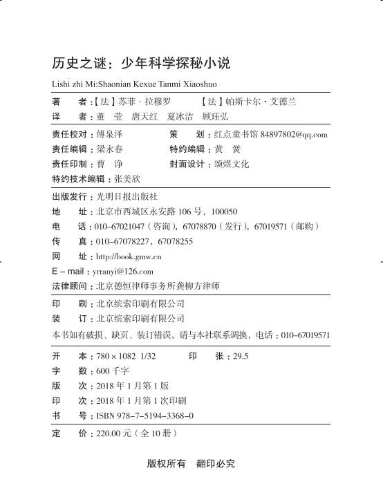 这一套书共十分册,分别是《图坦卡蒙的诅咒》《铁面人》《热沃当恶兽》《喜马拉雅雪人》《魔鬼百慕大三角》《消失的亚特兰蒂斯》《死而复生的路易十七》《复活节岛神秘石像》《尼斯湖水怪》《拿破仑之死》。十个故事,十个发生在不同时间、地域的神秘事件。 埃及法老图坦卡蒙死后陵墓一直没被发现,直到20世纪末,被一支考古科察队在一个偶然机遇下发掘,可是此后不久,接触到法老陵墓的人都一个个离奇死亡,这真的像坊间流传的,是法老的诅咒吗?还是一场不为人知的阴谋? 巴士底狱一直是关押法国国王的政敌的地方,可是在18世纪,这里关押了一个神秘的犯人,外界显少知道其存在,更没有知道他的身份,有人说他是路易十六的哥哥,有人说他是路易十六的情敌,他的身份到底是什么? 柏拉图曾在他的书中提到过一个神秘的古城——亚特兰蒂斯,千百年来人们一直寻找这个消失的古城,有人说这只是个传说,有人说它是确实存在的,有人说它在大西洋海底,有人说它在地中海内,考古学家和他的女儿来到瓜达维达湖寻找亚特兰蒂斯,他们经历了一次精彩绝伦却又危险重重的大冒险,他们*后找到这座消失的古城吗? 在大西洋,佛罗里达、波多黎各岛与百慕大群岛之间有一块三角区域,这里是地球上*神秘、*危险的地方之一,曾有成千上百的船只在这里离奇消失,无影无踪。围绕着这些神秘事件,从民间到科学界,流传着各种猜想:时空蓝洞、海洋胀气、神秘磁场。到底什么事这些失踪事件的罪魁祸首? …… 十个探险故事,让孩子在惊险刺激的故事中,来一场大冒险,快乐学习知识,轻松培养科学精神。