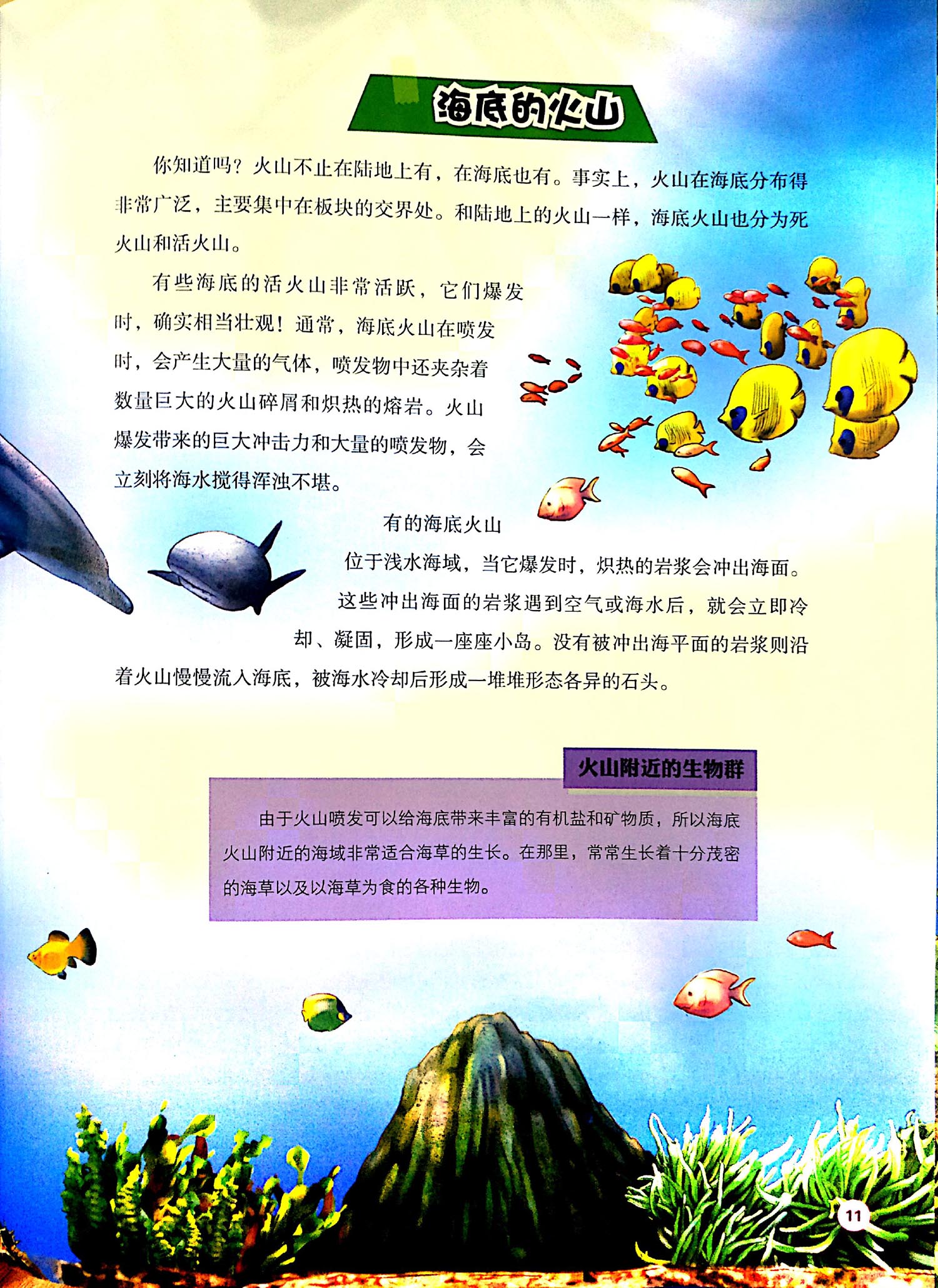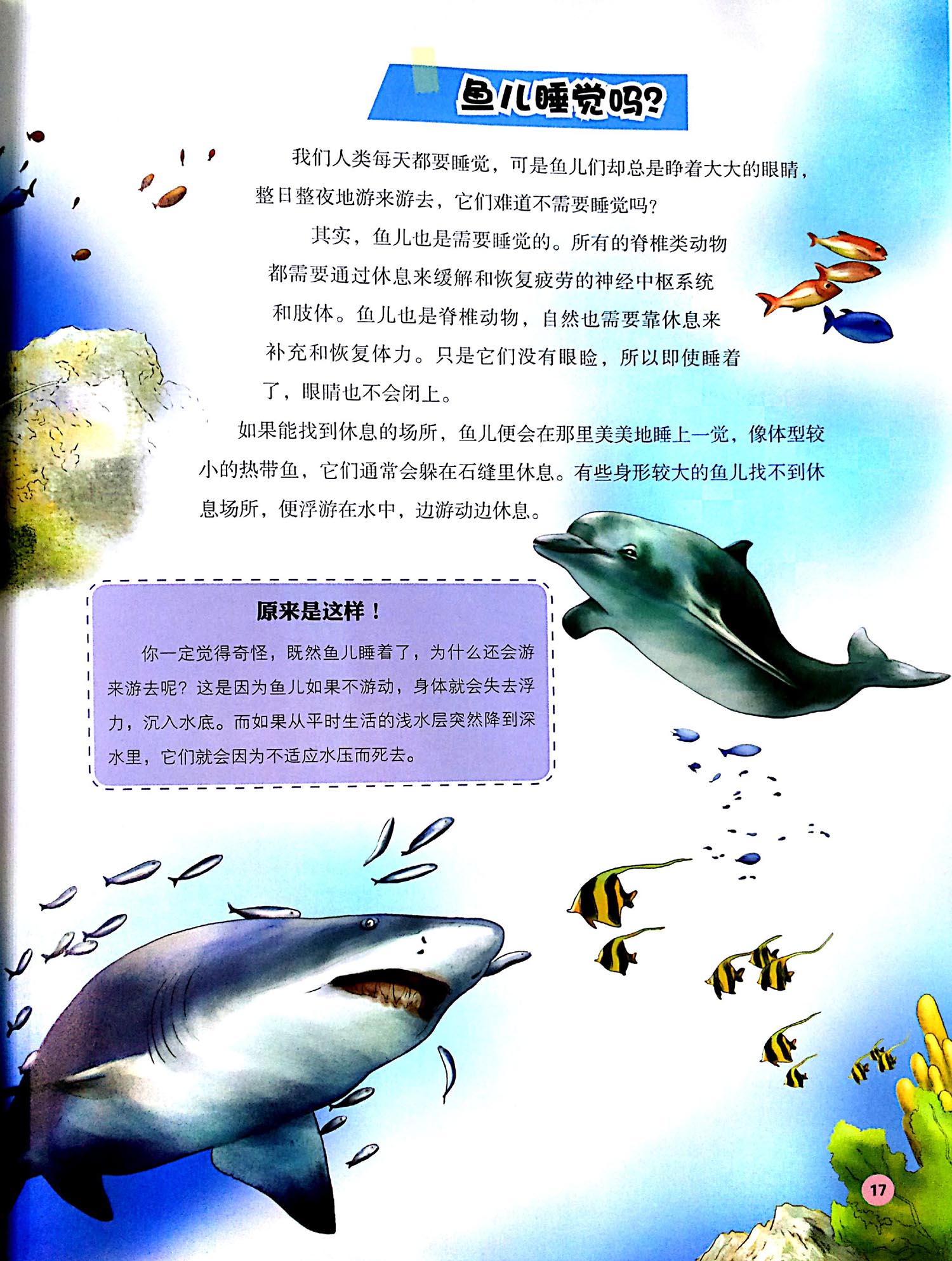 海狮海狮是哺乳动物,既可以在海洋中生活,也可以栖息在陆地。它们以大海中的鱼、乌贼、海蜇等为食,没有固定的柄息场所,常常为了觅食而不得不四处漂游。所以无论是在赤道附近的热带海域,还是在北极圈附近的寒带海域里,人们都可以看到为寻找食物而聚集于此的海狮们。由于它们的天敌——鲨鱼总会时不时地潜伏在周围,因此,海狮们常常到陆地上休息,以保证安全。龙虾龙虾是一种节肢类动物。全世界约有四百多种龙虾,其中北美洲地区的种类和产量是最多的。在众多的龙虾品种中,龙虾虎是最重的一类。它们重达5千克以上,主要生活在热带海域,是龙虾中特别名贵的珍品。龙虾的腹部较长,上面分布着许多对左右对称的足。这些足都是游泳足,能为龙虾在水中快速地游动和路上快速地行走提供便利。绝大部分生物的m液都是鲜红色的,但有趣的是,龙虾的血液竟然是淡蓝色的。换“新衣”的龙虾龙虾的一生中要经历许多次换壳,仅在出生的第一年它就要换将近10次壳,一只成年龙虾每年至少要换3次壳。更有趣的是,龙虾喜欢把自己换下的旧壳吃掉。最初,人们在它们的内脏中发现龙虾壳时,还误以为它们是同类相食呢。螃蟹螃蟹和龙虾一样,也是节肢动物。它的身体被包裹在硬壳里,成天挥舞着两只耀武扬威的大钳子,眼睛长在头顶,一副目中无人的样子。螃蟹用腮呼吸,喜欢横着行走。更有意思的是,螃蟹们在陆地上行走一段时间后,嘴里总会吐出许多泡泡。这是为什么呢?原来,螃蟹来到陆地后,就会吸进大量的空气,吸进的空气超过一定的数量,鳃里的空气和水分就会一起从嘴巴的两边跑出来。螃蟹的两只大螯可不仅仅是用于防身、斗殴的,还是它们求偶的得意武器呢!在求偶的季节,公螃蟹会在异性面前用力地挥动两只孔武有力的大钳子,以显示自己的力量与健美,借此吸引异性。不可生食的螃蟹螃蟹虽然美味,但是万万不可贪鲜生吃。这是因为螃蟹的体内寄生着肺吸虫,这种寄生虫进入人体后,会破坏肺组织,导致咳嗽。严重的甚至会进入人体的大脑,造成瘫痪的可怕后果。而人们只需对螃蟹稍微加热,肺吸虫就可以被杀死。章鱼章鱼是一种软体动物,它有8个腕足,每个腕足上都有许多吸盘。在遇到危险时,章鱼会喷出墨汁,迷惑对手的视线,然后趁机逃走。除此之外,章鱼还能不断地变换身体的颜色和造型。善于伪装的章鱼,通常会将自己打扮成一块覆盖了海藻的石头,等到猎物靠近,就会突然发起猛烈的攻击。章鱼都是雌雄异体,它们一般在冬季交配。章鱼一次能产卵约10万颗以上,它们将卵产在岩石下面或是洞穴中。幼小的章鱼宝宝被孵化出来后,会先随着浮游生物一起漂流几周,然后再静静地沉入海底,隐藏起来以求安全长大。钻进瓶子里的大章鱼有趣的是,章鱼还有一个奇怪的癖好,就是喜欢钻器皿。之所以得出这样的结论,是因为人们曾经在英吉利海峡里打捞出一个瓶子,发现里面藏了一条大章鱼。