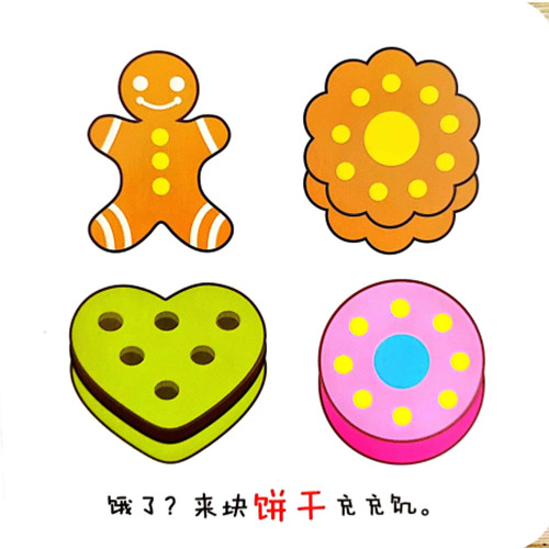 内容的选择上既有包子、饺子、鸡蛋等健康食品,也选了一部分糖葫芦、棒棒糖、冰激凌等垃圾食品,配合右页的文字描述,告诉小朋友要健康饮食,自己学会甄别健康食品。
