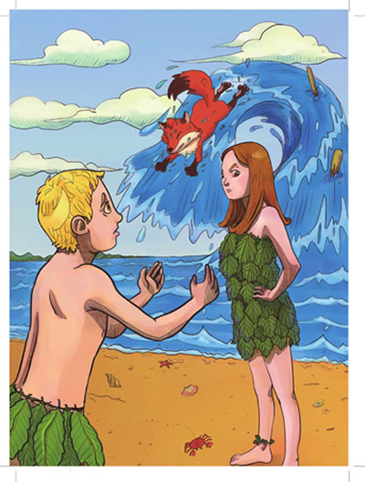 “孩子,回乐园已经不可能了。你和你的子孙后代都必须要生活在这苍凉的天地间,只有用辛勤的汗水和艰辛的劳作才能换来成熟的果实。我知道你们现在还没有学会基本的生存技巧,今天特地给你送来一根神棒。你只要用它轻击水面,就会得到一只对你有用的动物。但是无论如何也不能让夏娃碰到这根神棒,否则后果很可怕。”说完,上帝就不见了。