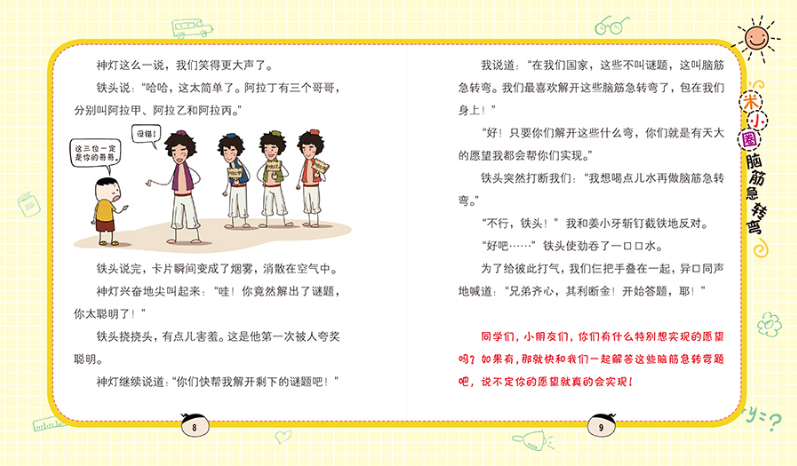 米小圈、姜小牙和铁头偶遇了一位被困在神灯里的灯神,灯神告诉米小圈三人,如果答对规定的脑筋急转弯就能解救被困的他,作为回报,灯神会实现他们三个愿望。好朋友三人组兴奋地开始了智力问答。作者以米小圈和小伙伴解救被困灯神为主线,将故事与脑筋急转弯题相结合。每一次闯关结束,神灯都满足了他们的一个愿望。但巧妙之处在于,故事中愿望的设定不仅具有幽默感,还富于教育寓意——天真的铁头只需要一瓶酸梅汤、两瓶酸梅汤……尽管*后好朋友三人组有了一个大大的愿望,并且*终闯关成功,而就在要说出愿望的关键时刻,因一个让人啼笑皆非的意外事件,他们被迫实现了另一个“并不想要的”愿望。故事情节曲折起伏,一问一答妙趣横生。