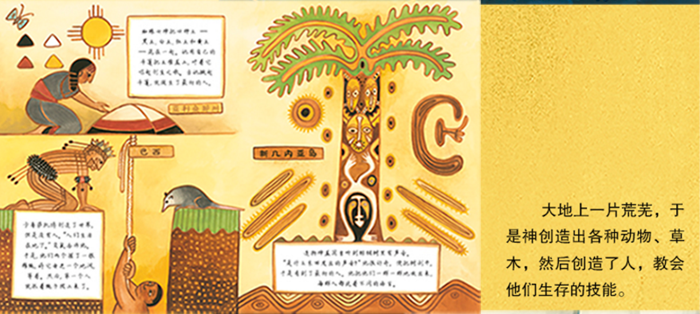 书中的语言简洁、概括,将世界各地异曲同工的神话元素高度浓缩,图画具有鲜明的民族风,蕴涵了许多图腾式的装饰性的图案,能够吸引人不知不觉深入故事之中。多元文化的交融可以扩充孩子的知识面,还能引起孩子对世界不同民族和文化的好奇心和求知欲。