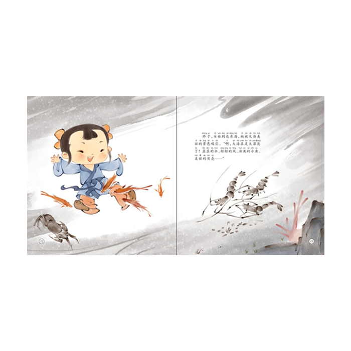 1.水墨画和版画。以《猴子捞月》为例,每一幅都美得不要不要的,猴子们的表情也都刻画得非常生动。*可以裱上画框,挂在自家墙上。浓郁的中国风使这本书区别于市面上其他绘本。