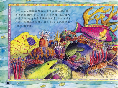 海底的珊瑚礁蕴藏着许多神秘的城市,里面充满了美丽的色彩和蓬勃的生命。你只要穿上潜水服,就可以和鹦嘴鱼一起去参观美丽的珊瑚礁了。海底世界会满足你无穷的好奇心。你会发现,珊瑚如何把海底世界装扮得如此美丽。你可以和鱼群一起游泳,可以静静地凝视着大龙虾和海星。你还会遇到一些珊瑚礁的常客——海豚、海龟,甚至鲨鱼。你可以在那里学到科学家对礁体生物的分类方法,懂得珊瑚礁对整个海洋和世界的重要性。鹦嘴鱼是珊瑚礁中的一个访客,它会带你游览海底世界,赶快准备好和它一起去冒险吧!
