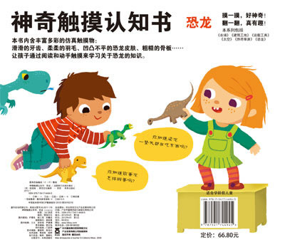 这书不错,里面有翻翻而且还有触摸,,,孩子也比较喜欢,最主要是画的比较可爱,起码不会吓到孩子,之前给小侄子买过关于恐龙的书,把孩子吓的一直哭,呵呵,我给我家宝宝先买这本比较可爱的恐龙书,孩子挺喜欢的,整天拿着书摸,孩子现在是看什么书,都要先用手摸摸,看看有没有触摸的地方。。。。孩子还是比较喜欢触摸书!