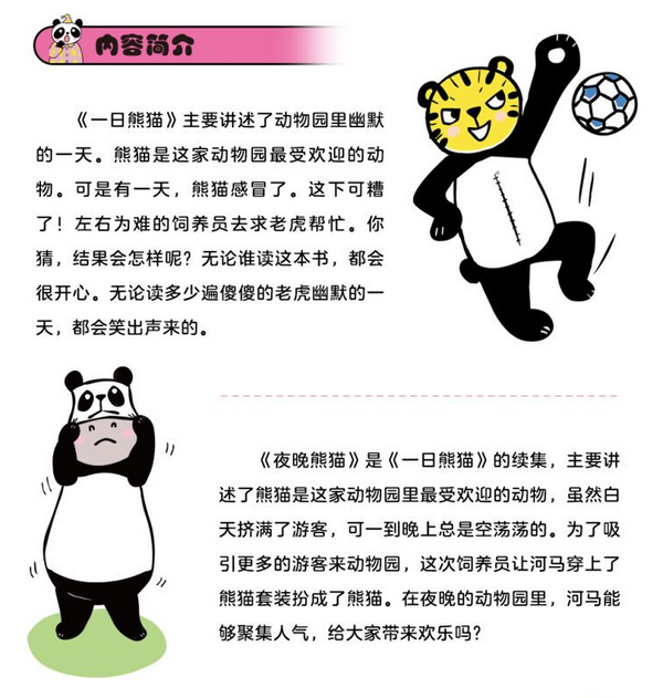 《夜晚熊猫》是《一日熊猫》的续集,主要讲述了熊猫是这家动物园里*受欢迎的动物,虽然白天挤满了游客,可一到晚上总是空荡荡的。为了吸引更多的游客来动物园,这次饲养员让河马穿上了熊猫套装扮成了熊猫。在夜晚的的动物园里,河马能够聚集人气,给大家带来欢乐吗?