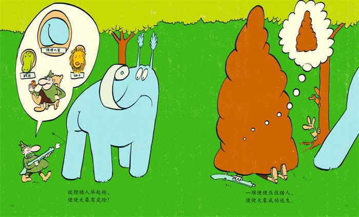 翻开书,我看到便便大象用便便完成一项又一项不可思议的救援行动:帮助在森林里迷路的孩子、扑灭熊熊火焰……每次成功后,便便大象都会露出孩子般调皮而得意的笑容。看到便便大象拉出一坨又一坨便便,我似乎听到了孩子们在看书时发出的笑声。