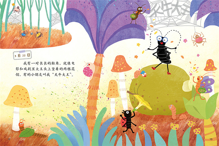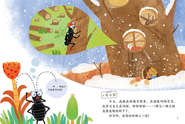 5月11日我刚刚出生的时候,爸爸对我说了一句让我一辈子都忘不掉的话:“我们最牛,我们是天星天牛。我们是‘会飞的牛’。”5月13日小时候,我白白的,软软的,乖乖的。妈妈说:“好可爱的小宝宝啊!”5月16日冬天,我躲在树缝里做梦。在温暖的蛹室里,我梦见自己在伐树,嚓嚓嚓嚓……一棵又一棵大树轰隆轰隆地倒下了。好累啊,真想好好睡上一觉!……