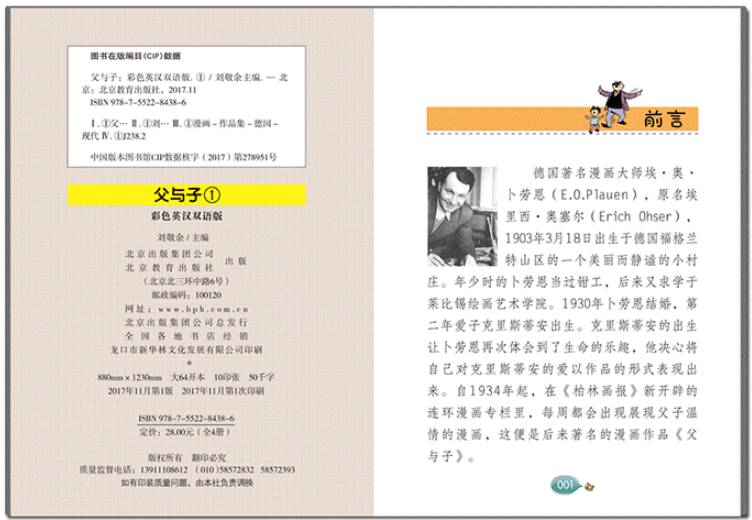 《父与子》德国著名漫画大师埃?奥?卜劳恩的不朽杰作,它誉满天下、风靡全球。作品塑造了善良、正直、宽容的艺术形象,处处充满着智慧之光,时时流露着纯真的父子之情,深深打动了无数读者的心。作品中生动幽默的小故事均取材于卜劳恩日常生活中的真实体验,一幅幅小而精湛的画面跳跃着智慧的光芒,简单的线条里流淌出纯真的父子之情与融融天伦之乐,震撼人心。本书文字根据《父与子全集》的漫画而编,全书采用中英对照的方式,力求原汁原味、妙趣横生地表达父子间的亲情与淳朴的天性,让读者既能更好的理解漫画的幽默,又能学好英文,可谓是一举两得。