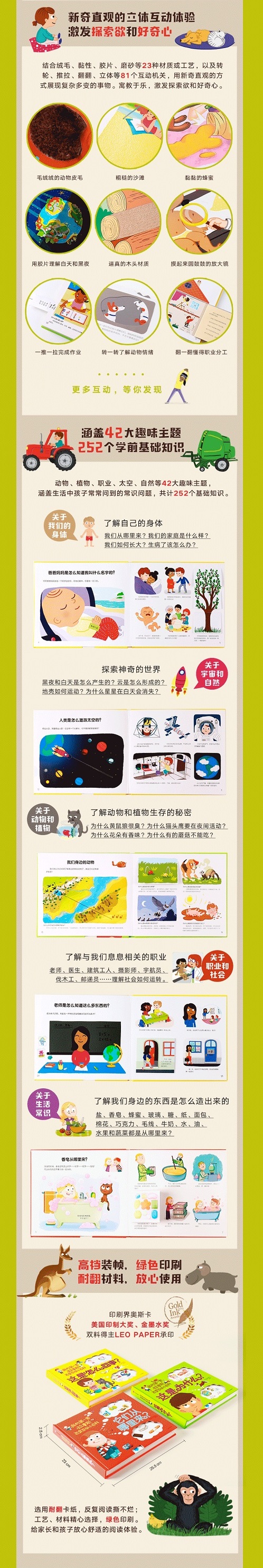 结合绒毛、黏性、胶片、磨砂等23种材质或工艺,以及转轮、推拉、翻翻、立体等81个互动机关,用新奇直观的方式展现复杂多变的事物。摸一摸、转一转、推一推、翻一翻,亲子共读,边玩边学,寓教于乐,激发探索欲和好奇心。