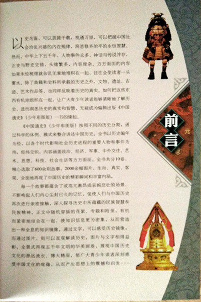 《中国通史(少年彩图版)》专为广大中小学生读者量身定制。全书以历史编年为经,以各个时代影响社会历史进程的重要人物和事件为纬,内容涉及政治、军事、经济、文化、外交、科技、艺术、民俗等诸多方面。全书共分10卷,上起神话传说时代,下迄清王朝结束,选取了600余个主题,2000余幅图片,生动、真实、客观、全面地再现了中国历史的精彩瞬间和丰富内涵。生动流畅的文字、异彩纷呈的图片、新颖活泼的版式、精美考究的装帧设计,使广大小读者在获取知识的同时,尽享全新的阅读感受。