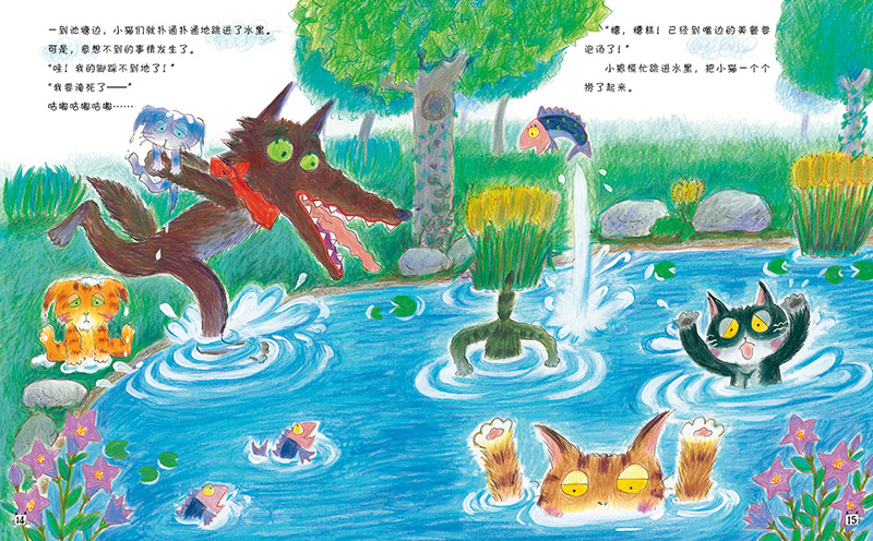 故事里有好玩的情节:一开始我们还不免有些紧张:五只毫无反抗能力的小猫落入饥肠辘辘的小狼手里,会不会被吃掉?随着故事的展开,我们不仅因为小狼始终吃不到小猫而松了一口气,还因为小狼被小猫的顽皮天性弄得手忙脚乱、狼狈不堪的模样而忍俊不禁。出人意料的是, 最后小狼居然开起了幼儿园,“专职” 带起了孩子。作者凭借把握冲突的超强能力将剧情设置得跌宕起伏,既在情理之中又在意料之外,自然也就让人感觉十分精彩了。