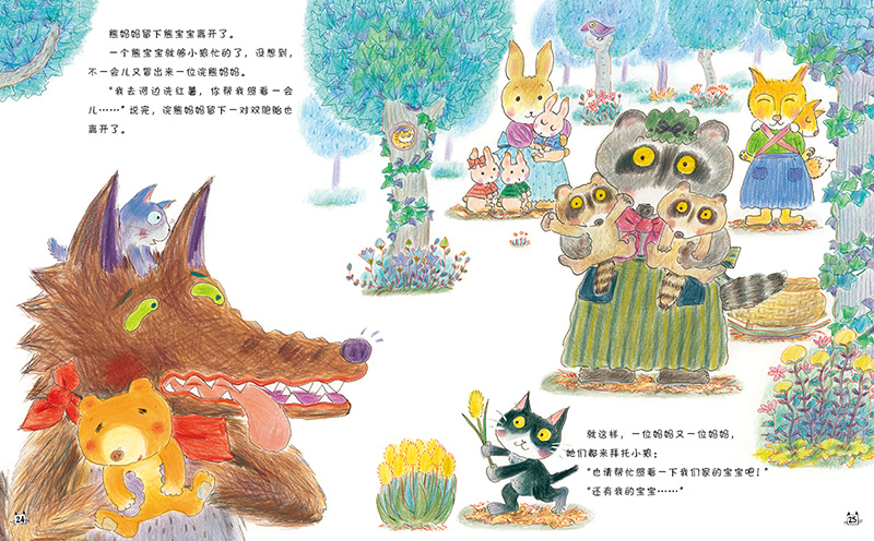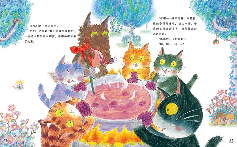 故事里有好玩的画面:中村阳子的绘画风格一如孩童的涂鸦,明媚而丰富。如果细看画面,小狼的呆萌和小猫们的天真表情、小狼红色的小围脖以及周围的小花小草小动物都