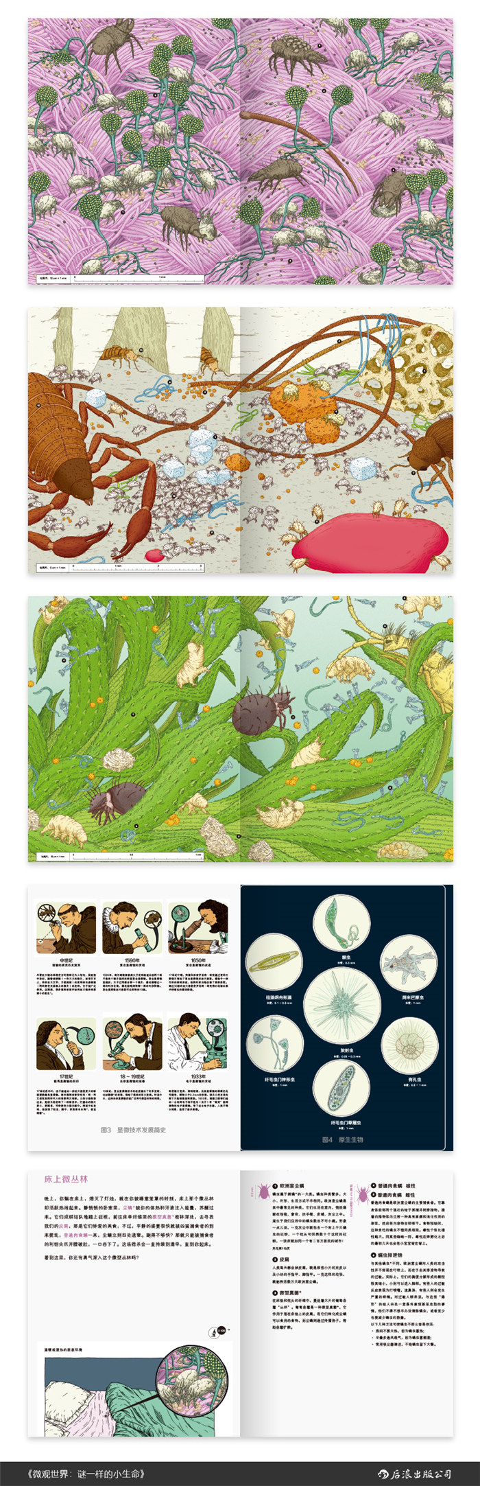 这本少儿科普图画书因其内容的独创性和严谨的科学性荣获2017年博洛尼亚国际童书展非虚构类“评审特别推荐奖”、2017年法国高等教育和科研部颁发的“科学趣味奖”和2018年法国上塞纳省“科学无秘密奖”青少年组奖。在我们身边,有无数渺小的生物,我们用肉眼甚至无法看到,但它们无处又不在——从洋底到海边,从森林土壤到家中厨房,它们在床单上,也在我们的皮肤上……《微观世界:谜一样的小生命》选取了十个代表性场景,并将局部放大数倍,小读者将看到十个放大的微型生态系统,近百种与我们亲密如斯、共创世界的微型生物,生动的描述,专业的介绍,写实性和艺术性兼具的图画,将带领小读者开启意想不到的全新视角。