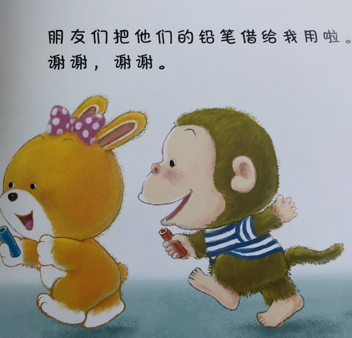 我的小铅笔坏了。朋友们把它们的铅笔借给我用啦!谢谢,谢谢。