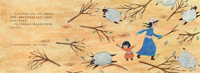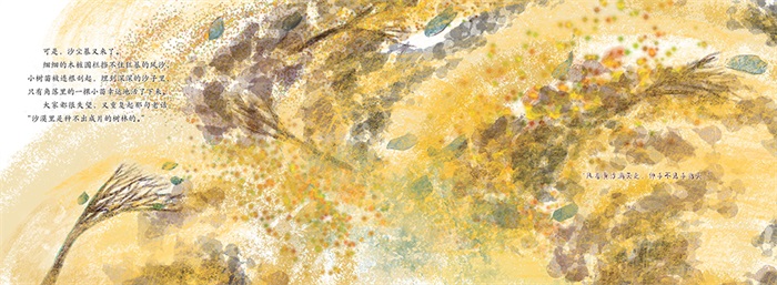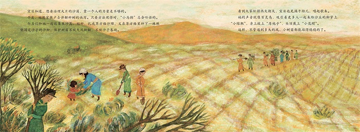 这是一个取材于真实背景的绘本故事,讲述了吃苦耐劳的牧民们治理“消失的沙漠”毛乌素的故事。故事中,一个叫宝日的女孩就在这片沙漠里长大,面对恶劣的生存环境和难以克服的困难,她不愿逃离,只想努力改变。凭借着自己坚韧的意志和永不服输的精神,宝日带领家乡的人民一起引水拉沙,改良土壤,发展灌溉,植树造林,慢慢地总结出了一套科学的治沙方法,一点点改变着西北大漠的样貌,见证着沙漠到绿洲的巨变。