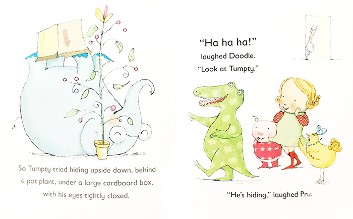 Tumpty is trying his hardest to hide ...will he ever succeed? "I'm hiding," said Tumpty. "You can't see me!" But everyone can see Tumpty, upside down under a large cardboard box, behind a pot plant. It's very funny. But later when they really can't find Tumpty - not in the cupboard or behind the curtain or in the biscuit tin - suddenly it isn't funny at all...