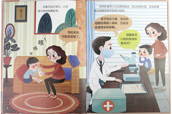 细菌人体奇遇绘本生动而详细地描述了细菌进入人体后的奇妙旅程,把一个神秘的微生物世界清晰而形象地呈现在孩子面前,让他们能了解到身体各个部位被细菌感染后会出现的状况以及产生的后果,指导他们要如何做才能预防细菌感染,帮助孩子养成健康的生活习惯。小北不小心着凉了,咳嗽不止。原来是细菌侵入了小北的呼吸道和肺部,然后开始疯狂捣乱。幸好有淋巴结阻止了细菌,身体也会通过咳嗽将它们排出体外。