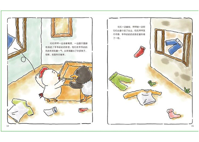 一天,奶奶洗了床单晾在院子里,就去了集市。 风越吹越大,床单摇摆得越来越厉害,不知不觉地,绳子已经自动解开了。 叽叽望着在天空飘动的床单,突然觉得心里痒痒的。她拍拍翅膀,高兴地叫起来:“呷呷!我想到了一个好主意!”叽叽呷呷一边捂着嘴笑,一边蹑手蹑脚地溜进了爷爷奶奶的卧室。他们在爷爷奶奶的衣柜里乱翻一气,从里面翻出了许多袜子、裤头、衣服和旧被单。叽叽呷呷把衣柜里的衣服都扔了出去,然后他们来到了窗外,把衣物一件接一件地丢进了风里。叽叽高兴地叫起来:“看,我做了一个三角形的风筝!”呷呷也不甘示弱,他做了一个菱形的大风筝。叽叽呷呷又朝风里扔了袜子、被单和衬衫,他们全都像风筝一样飞上了天。地上的东西还没有扔完,叽叽又爬上了爷爷奶奶的窗台,唰啦啦!一张桌布又飞出了窗外!叽叽呷呷把桌布抛到半空,大风又把它卷上了天。圆形的风筝又飞起来啦!