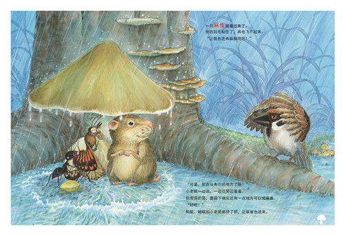 ★ 本图画书画面变现力强,水彩画的风格细腻、写实,色彩丰富。每一只动物的皮毛都根根清晰可见,雨中花草的状态也都十分真实,能够轻松地将读者带进迷人的童话森林。