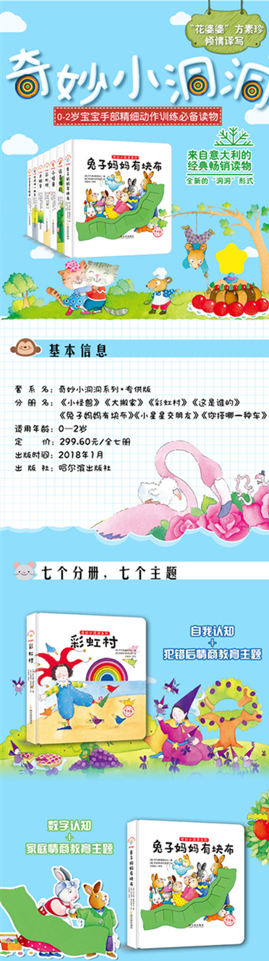 《奇妙小洞洞系列》目前包括7个分册,分别是 《小怪兽》《兔子妈妈有块布》《小星星交朋友》《彩虹村》《你搭哪一种车》《大搬家》《这是谁的》。