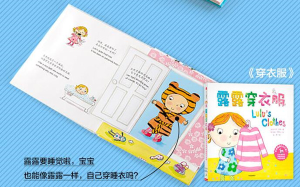 这是一套适合0-6岁小朋友阅读的创意互动玩具书,主人公是一位来自英国的橙发小女孩露露。她有着圆圆的脸蛋、别着发夹,可爱的造型与温暖的故事内容让大人和小孩都爱不释手。以日常生活经验为题材,从穿衣服、学穿鞋、吃午餐、上厕所、过圣诞五大主题入手,搭配趣味互动形式,增添阅读的乐趣,训练宝宝小手肌肉,让宝宝在趣味游戏中和露露一起养成生活的好习惯! 摸一摸、翻一翻、系一系、拉一拉!快来和露露一起学习如何自己穿衣服吧! 露露要起床了。先帮她拉上条纹上衣的拉链吧!她穿上了红色的外套出去玩,猜猜衣兜里面有什么?有时,露露会帮妈妈洗碗,她能自己系好围裙吗?
