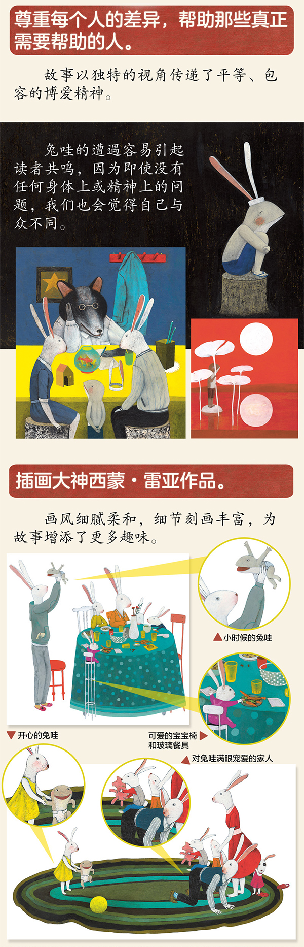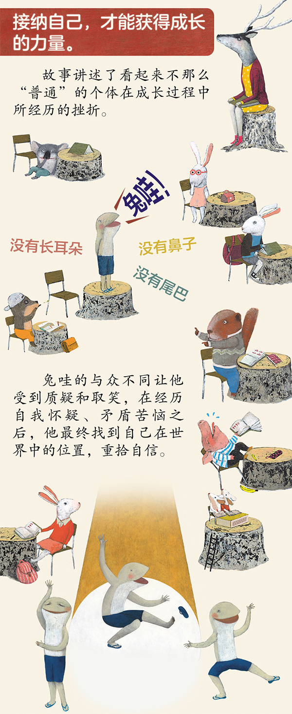 兔哇是兔子一家的新成员,但他长得不太像一只兔子,他没有耳朵、尾巴和鼻孔,还有一张大大的嘴巴。他的亲人非常爱他,但小镇上的邻居和学校的同学们觉得他奇怪,并嘲笑他。兔哇非常伤心,他想和大家一样。 他来到池塘边,望着天上的月亮,眼泪滴落进水中,泛起的涟漪模糊了月亮的倒影,就像月亮在跳舞。看着水中的月亮,他终于想通、释怀,与自己和解。这是一个关于自我成长的故事,通过兔哇的蜕变赞扬了积极向上的生命观,值得大人和孩子共同阅读。 ◎l故事寓意深刻,视角独特,探讨了自我成长、尊重差异、亲子关系等多个话题。 接纳自己,才能获得成长的力量。 这个故事讲述了看起来不那么“普通”的个体在成长过程中所经历的挫折。兔哇是一只不太“正常”的兔子,他的与众不同让他受到质疑和取笑,在经历自我怀疑、矛盾苦恼之后,他从大自然那里获得抚慰,找到了自己在世界上的位置,重拾自信。每个人都有自己...