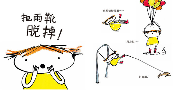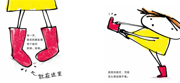 没有人可以让莫莉脱下雨靴或是换上别的鞋子。莫莉喜欢雨靴了,不管做什么、在哪里,她都穿着雨靴,就连睡觉时也不例外。有一天,她突然感觉脚趾的缝缝好痒好痒,她想挠却挠不着。莫莉试了好多方法,没有一个方法管用。终于,她意识到必须把雨靴脱下来……脱下雨靴的莫莉,依然喜欢雨靴吗?