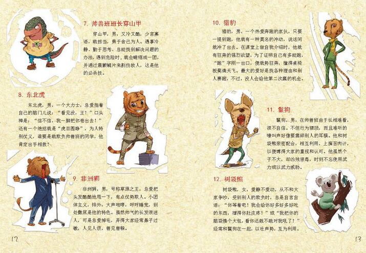 你看!火爆仗义的东北虎;黄色旋风般的猎豹;嚎叫声险些震碎耳膜的鬣狗;爱化烟熏妆的大熊猫;表面冷酷却爱心无限的穿山甲;摩拳擦掌的非洲狮;大智若愚的黑猩猩;娇小可爱的金丝猴;有事儿没事儿就要“喝两口”的吸血蝙蝠……