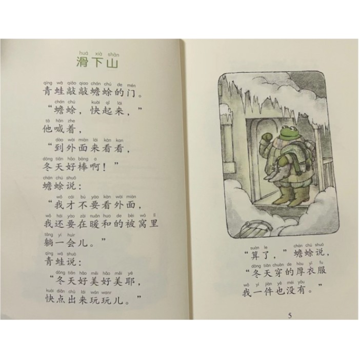 《青蛙和蟾蜍 拼音版》是一套专门针对5-8岁孩子推出的拼音版读物,包括《青蛙和蟾蜍 好朋友 拼音版》《青蛙和蟾蜍 好伙伴 拼音版》《青蛙和蟾蜍 快乐时光 拼音版》《青蛙和蟾蜍 快乐年年 拼音版》四册。 总共有二十个小故事,讲述青蛙与蟾蜍这一对好朋友生活当中的种种趣事。文字优美流畅,叙述方式幽默童趣,故事感人又好玩,这两个角色表现出的童心及纯真的友谊将使读者会心一笑。他们的友情与默契贯穿所有的故事,让读者在阅读时,从头到尾都沉浸在一种温馨的情绪中。然而,青蛙与蟾蜍特殊的个性、出人意料的行为及想法,又让故事的发展充满幽默风趣的惊喜。