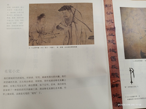 我们原始时代的祖先,对涂涂、写写、画画有很大的兴趣。他们用坚硬的木条、石头刻出痕迹,用树枝、草秆或者动物毛发蘸上颜料,在地上写出文字,画出图案,标下记号。后来,我们的先明发明了一种柔软的写字画画工具:将动物毛发捆扎在木棍、竹竿做成笔,这就是毛笔的“祖先”了。