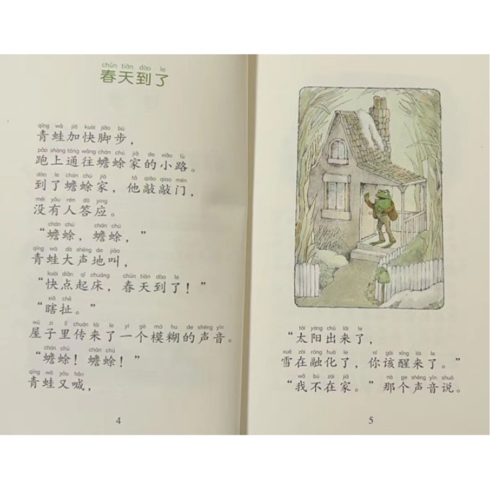 《青蛙和蟾蜍 拼音版》是一套专门针对5-8岁孩子推出的拼音版读物,包括《青蛙和蟾蜍 好朋友 拼音版》《青蛙和蟾蜍 好伙伴 拼音版》《青蛙和蟾蜍 快乐时光 拼音版》《青蛙和蟾蜍 快乐年年 拼音版》四册。 总共有二十个小故事,讲述青蛙与蟾蜍这一对好朋友生活当中的种种趣事。文字优美流畅,叙述方式幽默童趣,故事感人又好玩,这两个角色表现出的童心及纯真的友谊将使读者会心一笑。他们的友情与默契贯穿所有的故事,让读者在阅读时,从头到尾都沉浸在一种温馨的情绪中。然而,青蛙与蟾蜍特殊的个性、出人意料的行为及想法,又让故事的发展充满幽默风趣的惊喜。