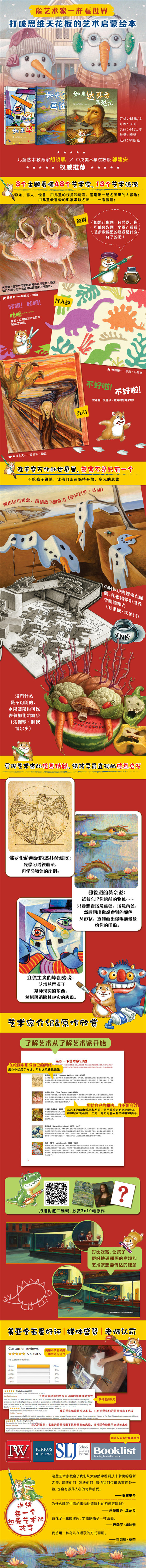 ·3个主题看懂48个艺术家&13个艺术流派 ·启蒙艺术思维,让孩子永远保持开放、多元的思维 ·展现艺术家的绘画精髓,学习绘画技巧和欣赏方法 ·文后附艺术家介绍,了解艺术家在成长和创作过程的坚持与思考 ·美国儿童艺术启蒙五星畅销书 ·《出版商周刊》《科克斯书评》《学校图书馆杂志》等国外*书评媒体盛赞