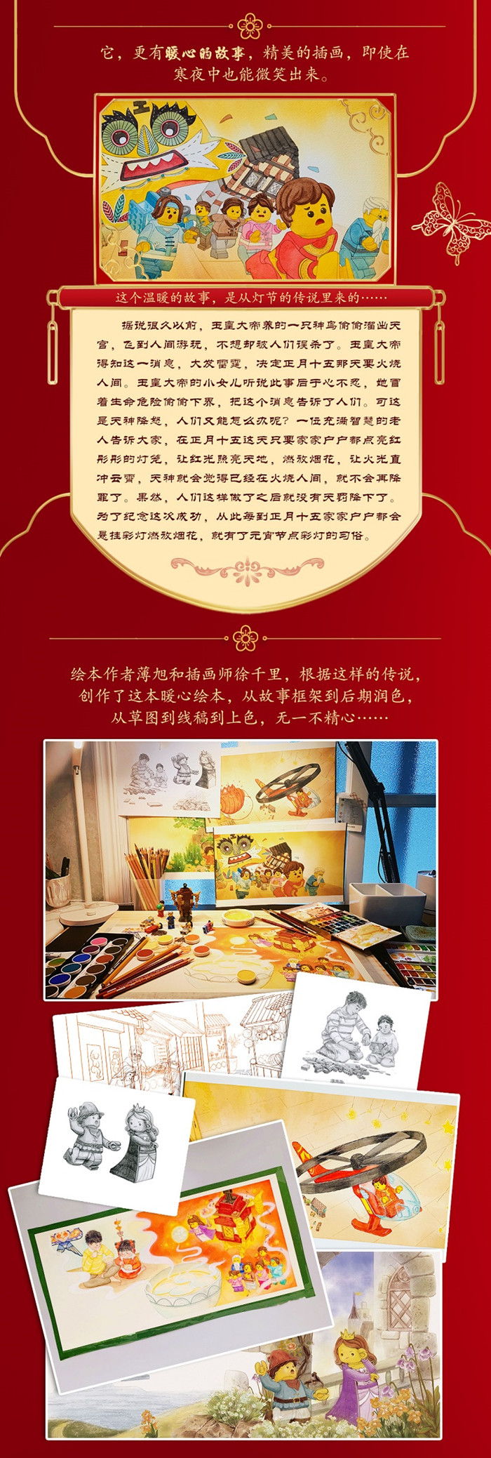 这是一本借助乐高积木讲述中国元宵节来历的绘本。故事充满了童趣,其中包含了元宵节的传说、中国传统花灯及吉祥纹样的讲究等。 乐高集团设计师专为本书设计了86颗粒的花灯小套装,也是本书除了内文画面之外的又一大亮点。 书中采取了中国传统故事里大家较为熟悉的元宵节传说,即人类因为射杀了神鸟引发天神震怒,要火烧人间,天神中一个善良的神仙提前告诉大家在正月十五那天要点燃灯火假装着火避开灾祸,从此就有了每年的灯节。书中乐高人仔们不小心弄坏了两个小主人中的小妹妹的灯笼,哥哥为了弥补,就用乐高搭出了花灯给她。在搭建中两个人和好如初并且一起开动脑筋寻找合适的零件。整个故事充满了温暖奇幻的色彩,内容积极向上,引导孩子们做错事时要勇于承担并尽量补救,遇到问题时要不畏困难努力克服。 本书画风采取水彩、彩铅及水粉综合上色的方式,画面清新亮丽。