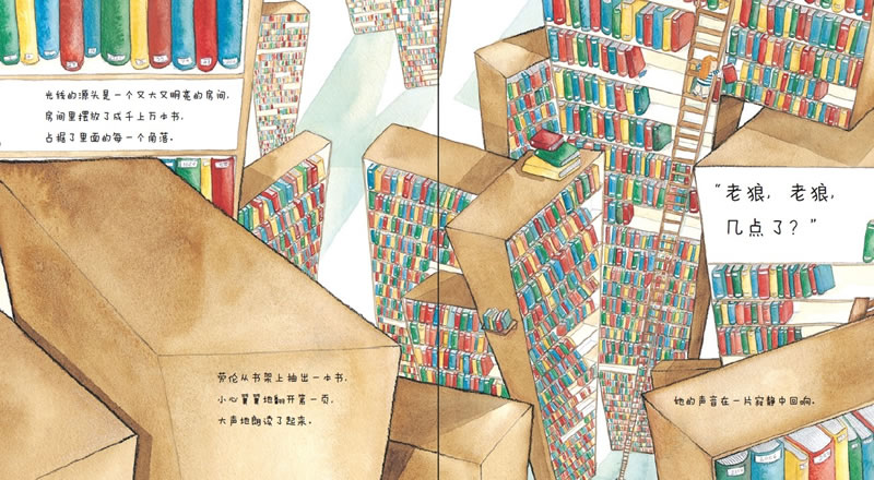 小女孩劳伦在祖父的钟表店里发现了一个隐藏在大座钟里的秘密。她不小心打开了藏在一个巨大图书室里的魔法书,放出了一只老狼,从而展开了她与老狼之间的时间游戏……获奖无数的插画作者吉玛 瑞娜女士,结合当下风靡全球的场地游戏“老狼,老狼,几点了?”,奉献出了这部充满魅力的插画作品。
