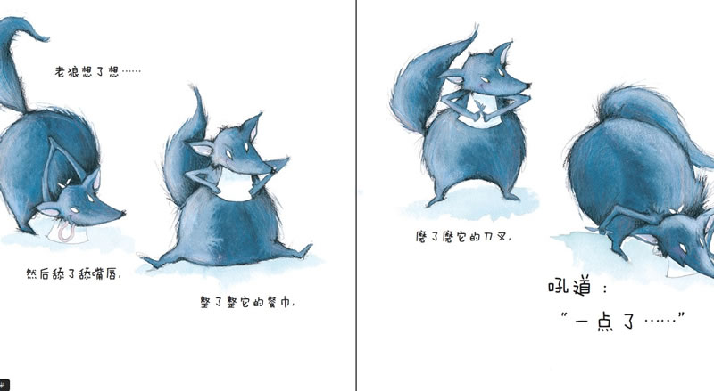 “老狼,老狼,几点了”是一个儿童游戏,这本同名的图画书拓展了这个游戏,把它铺陈为一个好玩的故事,不过故事中却饱含诸多哲理,需要慢慢品读。——儿童文学工作者 王林