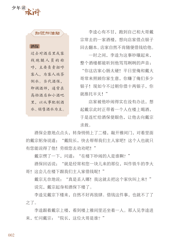 《水浒传》是四大名著之一,是学生的书目。但是原著的部分内容艰深晦涩,学生读起来难免遇到阅读障碍进而很难坚持读完。少年读水浒系列在遵循原著的基础上,将书中的主要人物提炼出来,经过专家的精心编写,删繁就简,去粗取精,并配以精美的插图,更适合学生阅读。本系列书将每个主要人物进行深度剖析和挖掘,涉及该人物的主要事件详细周全,非常方便学生理解名著中的主要人物,且名著中的重要事件在每本书中反复出现,情节严丝合缝,便于学生加深印象。李逵是水浒传中的一个重要人物,虽然他生性鲁莽,有勇无谋,但是他也有自身的优点,比如对母亲的孝顺,对宋江的忠诚。本册书围绕李逵,将他在水浒传中的主要事件提炼出来,进行全面的讲述,让学生对李逵这个人物形象有了更加立体的认知。