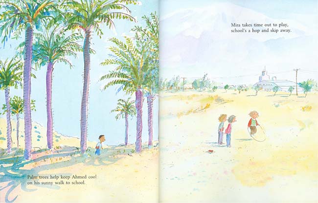 看了书后你会发现,哇!原来还有小朋友需要坐船,甚至缆车,马车去上课!全书看到不同国家,不同城市的自然风光,可以体会到不一样的人文风采;像是讲到住在意大利威尼斯的Bianca, Beepo,还Benedetto的时候,著名“水都”的风景呈现在眼前,水面波光粼粼,船上的人们看着岸上的建筑,别有一番异域风味。住在挪威的Niels和Solveig还需要滑雪去上课呢,是不是和我们平时坐校车去上学很不一样呢,还有好多好多住在其他国家的小朋友用着不同的方式去学校呢。……