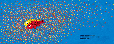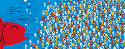 作品大胆地大量使用红黄蓝三原色,画面清爽、鲜艳,明亮,极富魅力。大开本的设计使画面更加丰满,尤其是小红鱼和小黄鱼被一大群孩子围绕着的画面,更加有张力而动人心弦。别致的护封上镂空出一条小鱼的形状,一旦打开护封——哇,强烈的视觉冲击一定会让小朋友爱不释手、目不转睛。