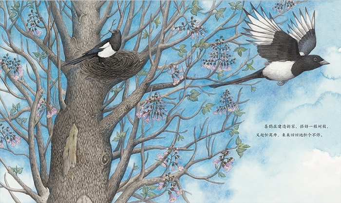 初春时节,我和孩子一起走进山间。 我看到渐渐复苏的野花野草、高大的树木,孩子听到了风声、鸟鸣,以及草木身后的世界。 绘本从一个天真、澄澈的视角,展示出一个看似处在荒凉初春,实则生机盎然的北方山林,颇具“同自然对话”的自然主义情韵。故事的结尾笔锋一转,也让孩子感受到一种辽阔、壮丽的自然意境。