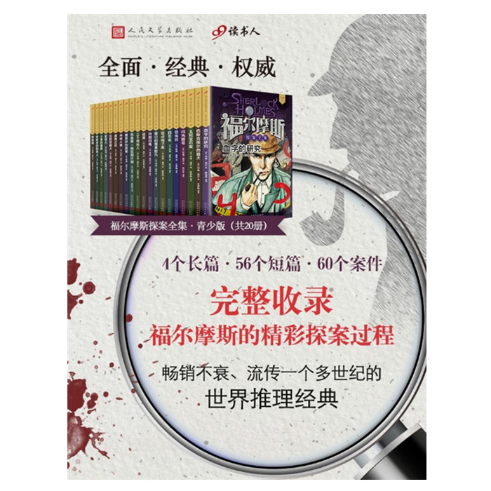 “福尔摩斯探案全集·青少版”系列(全20册)由台湾东方出版社授权,人民文学出版社与上海九久读书人联合策划,是目前中国大陆收录非常完整的青少版福尔摩斯探案集。本套丛书通过简单易懂的文字和生动精致的插图再现了世界推理经典的神韵。福尔摩斯是一位极具天赋的侦探顾问,生活在“雾都”伦敦一所简陋的公寓里。他拥有敏锐的直觉和严密的思维,善于将医学、心理学、史学、逻辑学、植物学、地质学、化学、解剖学等运用到实际案例中,重视调查和研究,还精通提琴和刀剑拳棍,可以说是跨时代的全才。这个无人不知、无人不晓的名侦探即是英国作家柯南·道尔所著4个长篇和56个短篇探案小说中的主角。对于从未接触过福尔摩斯这一形象的孩子而言,这套书深入浅出,让孩子在保留想象空间的同时,以直观的方式领略世界上受欢迎的侦探小说的魅力。福尔摩斯系列的诞生距今已有一个多世纪了,全世界有多种语言、多个版本不断面世并持续畅销,许多人对其中的故事情节耳熟能详。本套丛书涵盖了原著的精华,在忠实于原著的基础上,使得矛盾冲突更直接,情节更引人入胜