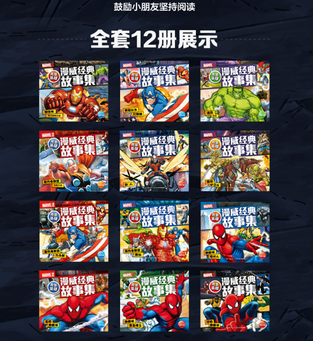 《我是英雄·漫威经典故事集》是一套为6-12岁男孩打造的漫威经典故事书,共12册。每册选用4-6个漫威英雄故事,将有趣、励志的英雄故事以丰富而精致的形式呈现给读者。故事采用大字注音的形式排列,图文对半,符合小读者的阅读习惯。每册书在故事开头设置编辑推荐、目录和人物档案,故事结尾处设置“小小英雄”勋章,完善小朋友的阅读体验。